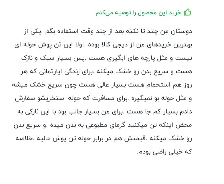 حوله پالتویی ابراهیمی یزد مدل T11 سایز 120 L ( لارج ) جنس الیاف طبیعی(سلولزی) ویسکوز سایز سایز S 34-38 اسمال سایز M 38-42 مدیوم سایز L 42-48 مدیوم سایز 48 به بالا XL ایکس لارج سایر توضیحات – 100% نخ طبیعی – 100% رنگ ثابت (راکتیو ) – جذب بسیار بالای آب – شستشوی آسان( شستشو حتی با آب داغ ) – نرمی و لطافت ویژه – خشک شدن سریع – سبک و کم حجم شاید گاهی برایتان اتفاق افتاده باشد که هنگام مسافرت از بس چمدانتان پر بوده نتوانستید حوله لباسی شخصی خود را با خود ببرید چون حجم زیادی را اشغال میکرده و شمکل ساز بوده است از ویژگی های برجسته حوله تنپوش پیش روش شما این است که حجم بسیار کمی دارد و این موضوع به خاطر متریال و ماده تشکیل دهنده این وله است مواد تشکیل دهنده این محصول ویسکوز یا همان الیاف گیاهی به دست آمده از باقیمانده درختان، گیاهان و .... هست که علاوه بر این که فوق العاده جنس نرم ولطیفی دارد، شاید به جرات بتوان گفت دو یا سه برابر وزن خود آب جذب میکند به خاطر همان شاید تعجب برانگیز باشد اینکه این حوله با این حجم کم و جنس به این نازکی چه طور میتواند این مقدار آب راجذب کند فقط کافی است یه مرتبه امتحان کنید تا به صداقت ما نسبت به خو اطمینان پیدا کنید نکته حائز اهمیت در این محصول این است که حس خوشایند گرم کنندگی بدن درهنگام استفاده لذت مصرف این محصول را دوچندان میکند خانه سلام ( مهدی زحمتکش )